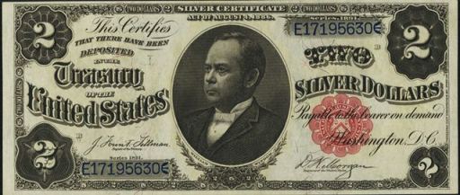 Series of 1891 $2 silver certificates feature a portrait of Windom at the center of each bill. As you guessed, collectors call these Windom notes. Don’t confuse the 1891 $2 treasury note with the silver certificate. They are from the same year with the same denomination. The note pictured above is really tough to locate in high grades, but it is relatively common in low grades.